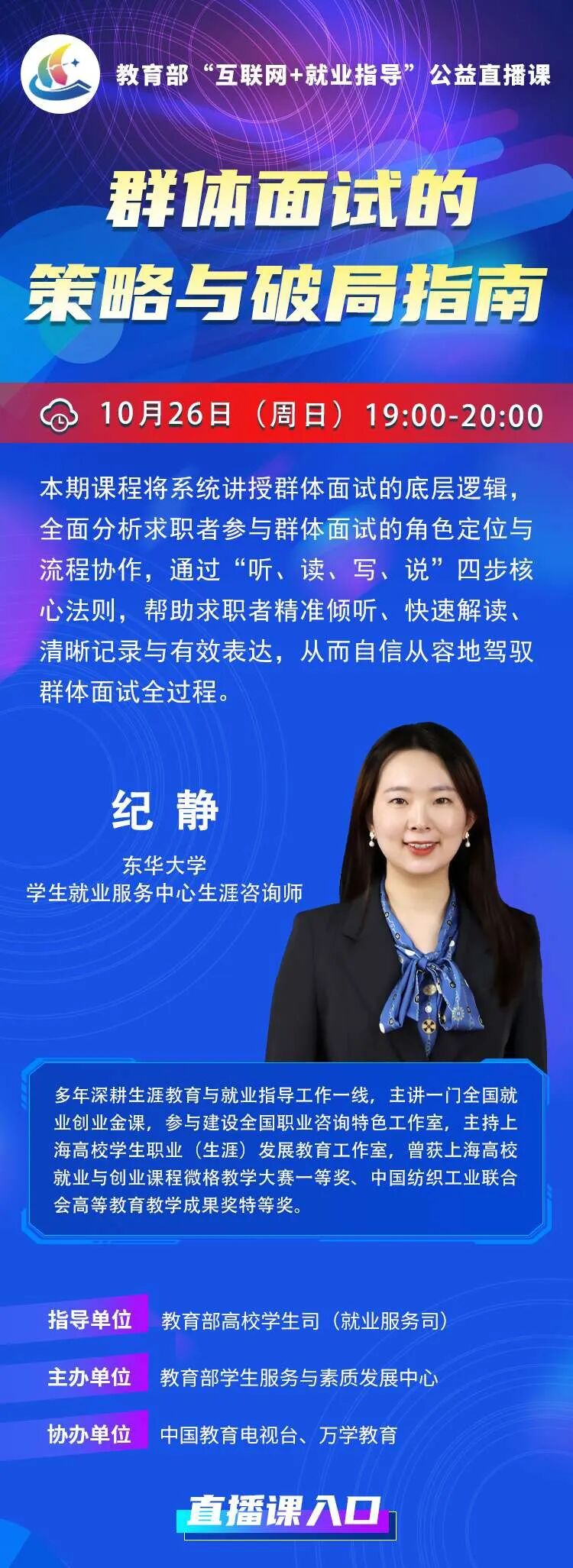 本期课程将系统讲授群体面试的底层逻辑全面分析求职者参与群体面试的角色定位与流程协作,通过“听、读、写、说”四步核心法则,帮助求职者精准倾听、快速解读、清晰记录与有效表达,从而自信从容地驾驭群体面试全过程