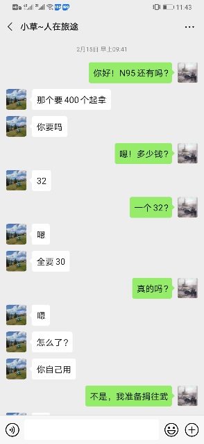 带着这份关注,2月15日上午,一位朋友在微信上发布的专用口罩信息吸引了陈老师。她看后马上联系这位常帮助代购的导游朋友,得知这是一批采购自迪拜的N95口罩,400只起拿,420只全要,30元一只。“怎么了,你自己用吗?”“准备捐武汉。”陈老师简明回复后,就为是否购买焦虑起来。“我担心是假货,但想着如果能采购到这批N95,寄给一线医护人员,又心动了……”