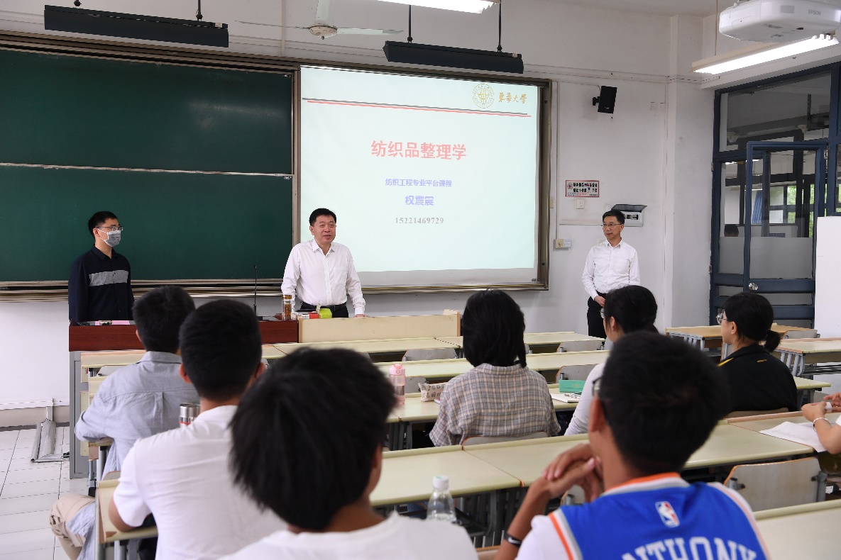 在《精细化学品单元反应原理》课前,俞建勇向学生问好,欢迎学生回归校园、回归课堂。他指出,上学期,全校师生经历新冠肺炎疫情“大考”,同学们积极配合学校线上教学要求,圆满地完成各项学习任务,交出令人满意的答卷。学校在新学期重新恢复常规线下教学模式,他叮嘱学生尽快适应新学期新环境,抓好疫情防控常态化新形势下的学习、工作和生活,学有所成、学有收获。在《纺织品整理学》课前,俞建勇表示,学校会扎实做好校园常态化疫情防控工作,筑牢校园安全防线,努力为学生提供一个安心舒适的学习环境。