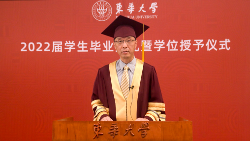 亲爱的同学们,六月的上海,栀子花开,毕业的骊歌再次响起。我们告别在鲜花怒放的盛夏,也许今天这场云上典礼因没有现场拨穗而显得不够完美,但它承载的祝福与期盼依旧。此去经年,希望大家记住这个春天的温暖与感动,带着东华给予你的涵养、学识、修为和品格,牢记国家赋予我们青年一代的使命和责任,勇敢去拼,放心追梦!